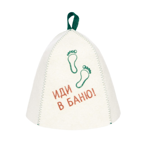 Шапка для бани "Иди в баню" классической формы сделана из белого войлока и украшена ярким принтом.